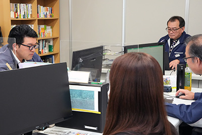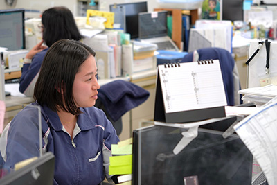 営業担当・業務課が連携し、協力会社や社内製造工程の進捗を把握しながら納期管理を行い、OA操作を活用した正確で迅速な対応を通じて、円滑なものづくりと安定した取引を支えています。